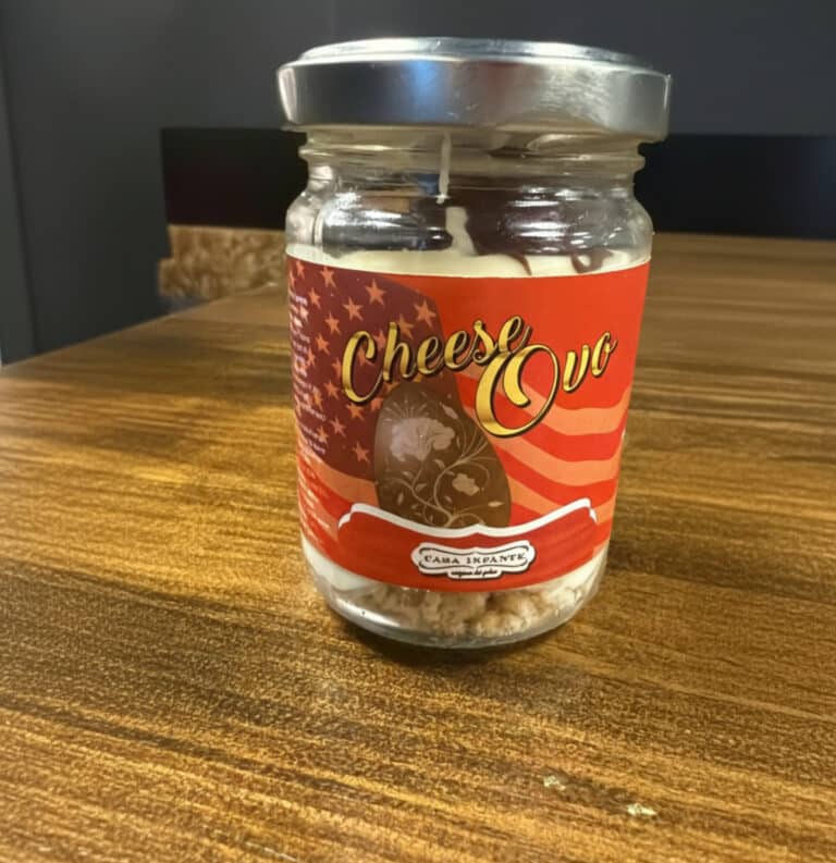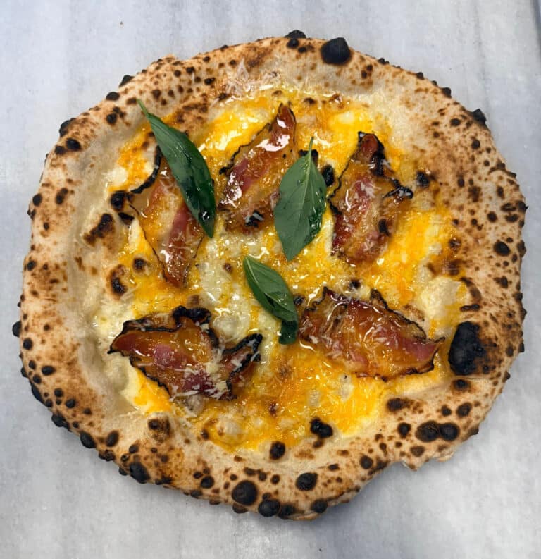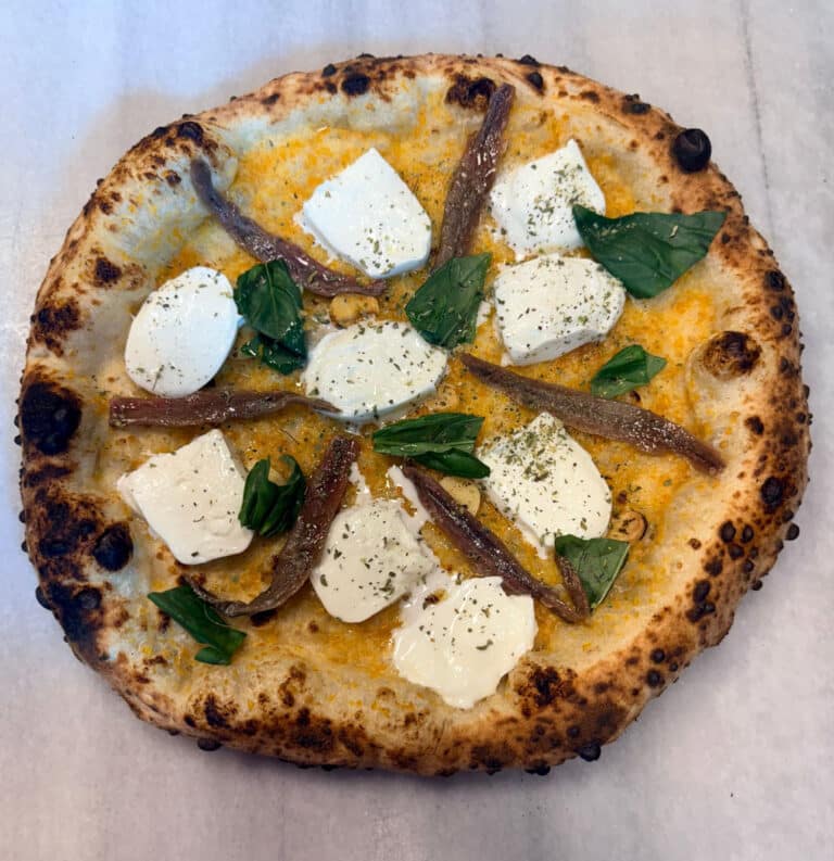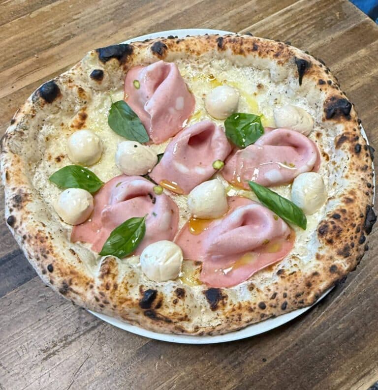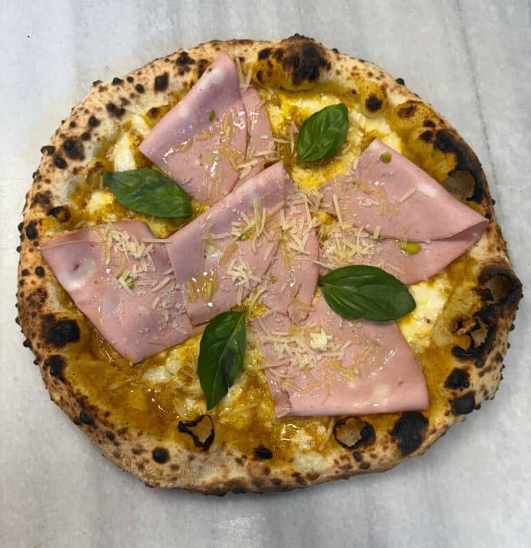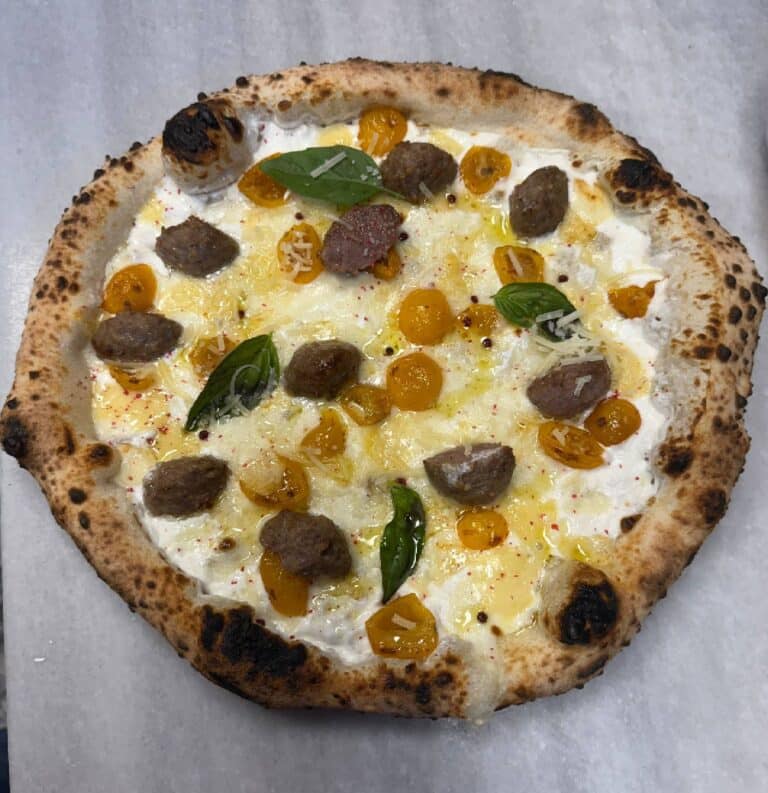 Base blanca, caciocavallo (queso de vaca ahumado ), mozzarella fior di latte, albóndigas de vacuno, tomate cherry semiseco amarillo, lascas de parmesano y pimienta roja