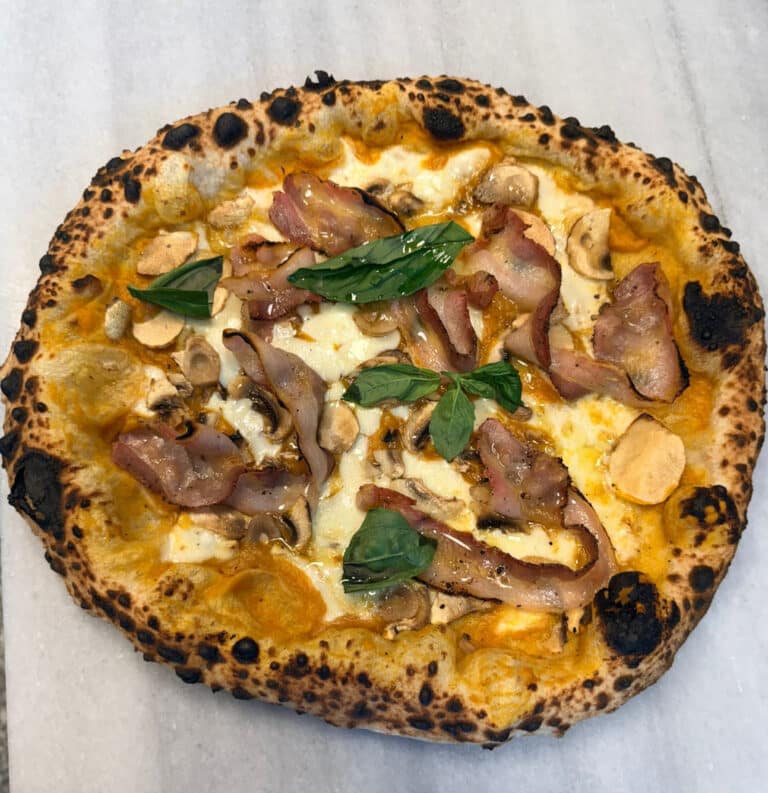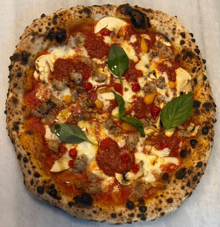 Base de salsa de tomate san marzano, mozzarella fior di latte, champiñones frescos, salsicha napoletana, crema de pimientos habanero, jalapeño y nduja (picante) Pimientos lagrimas amarillos y rojos