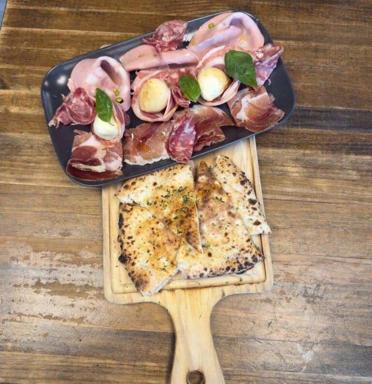 Lonchas de salame Napoli ( dulce),perlas de mozzarella ahumada de búfala y un choro de aceite de oliva virgen. acompañado de nuestra focaccia artesanal!